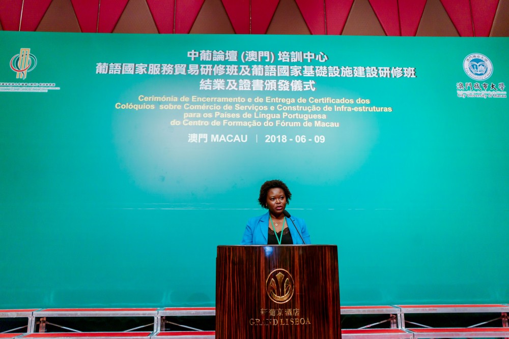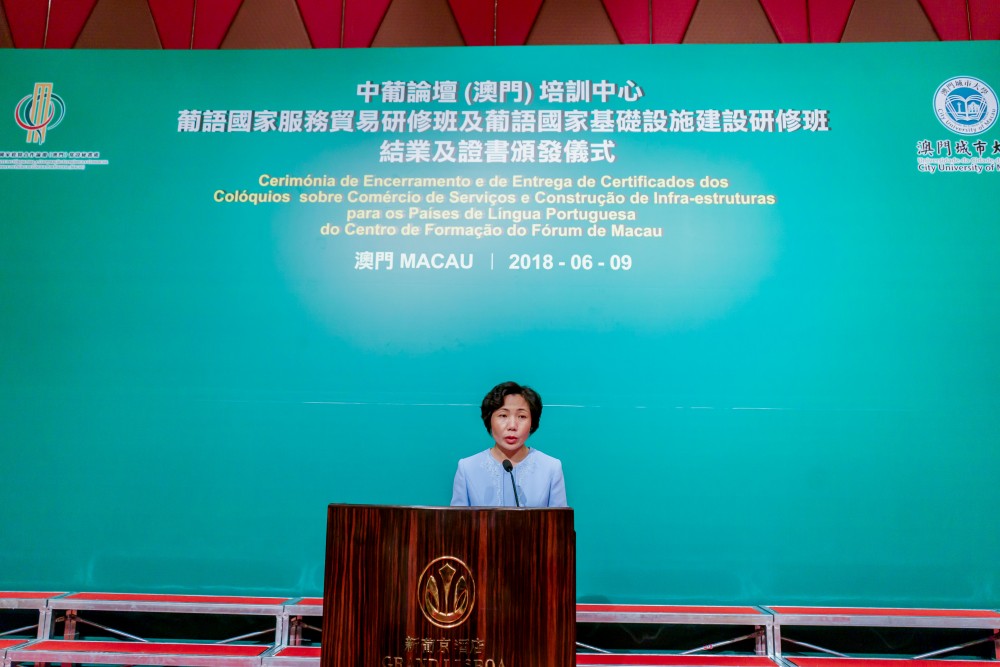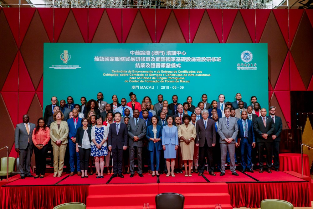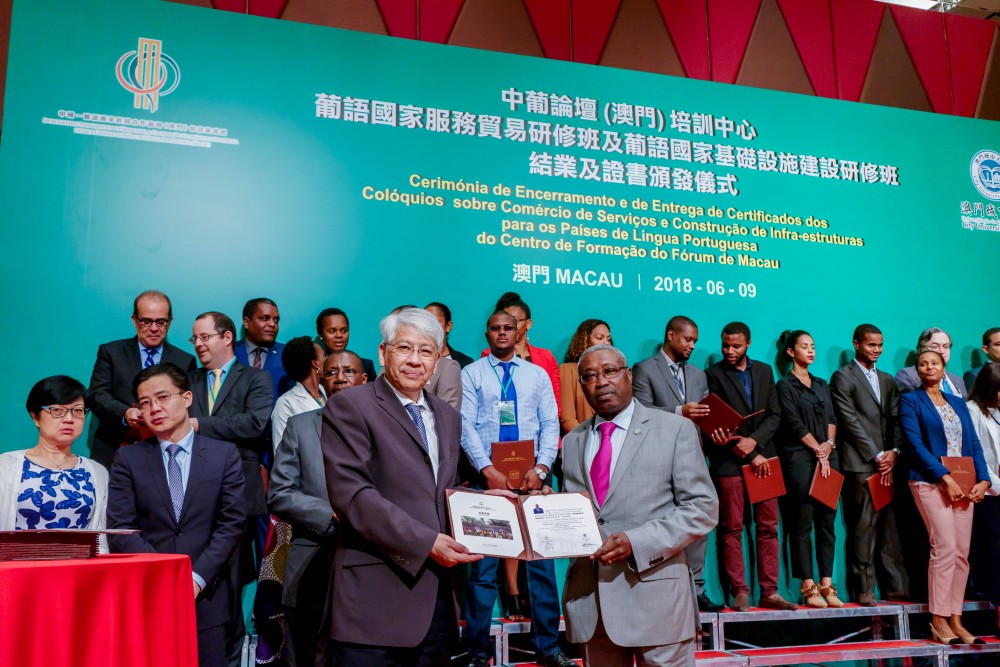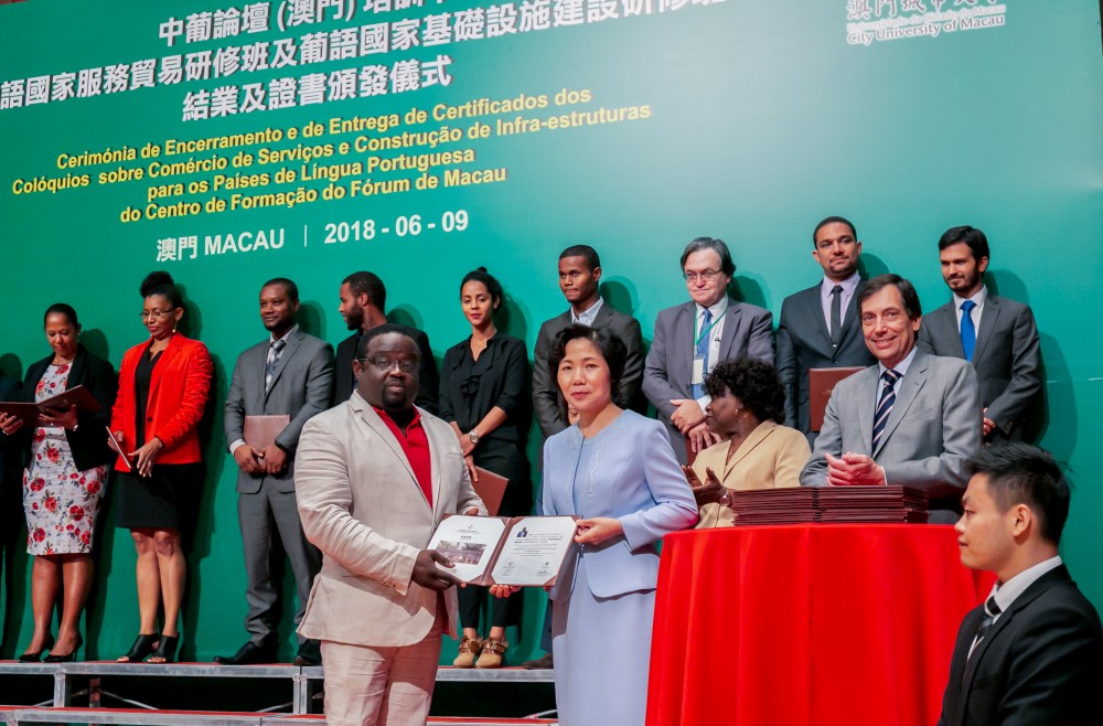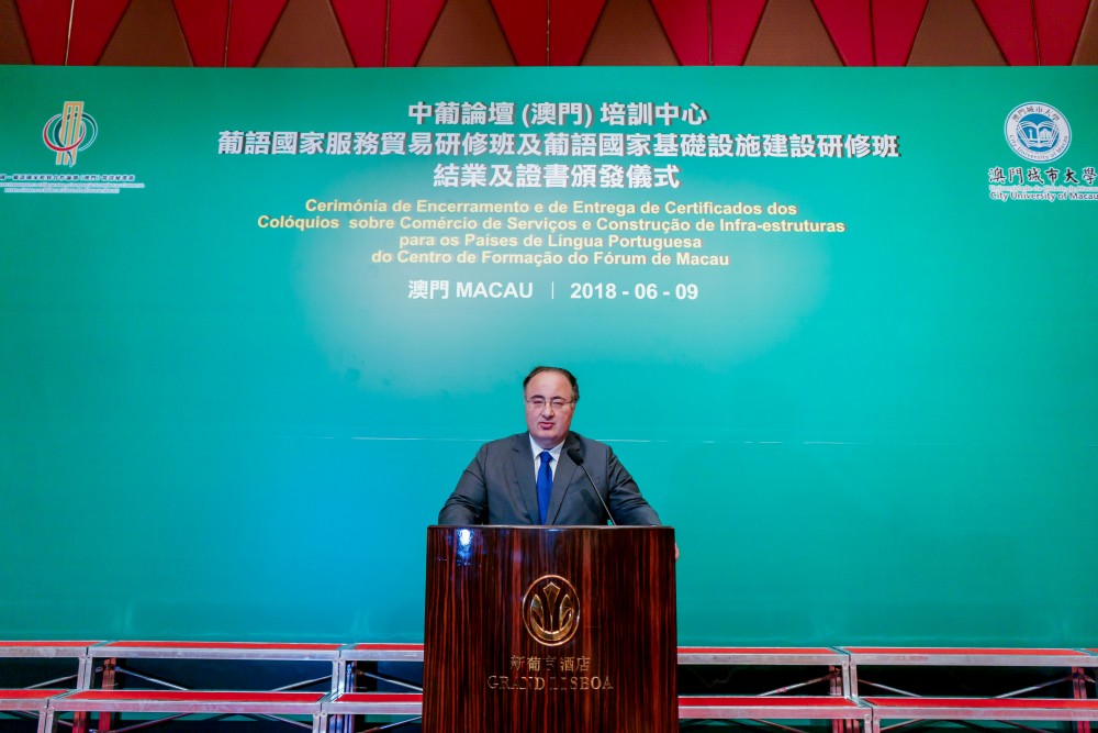 Co-organised by Training Centre of Forum Macau (Centro de Formação do Fórum de Macau) and City University of Macau (CityU), the Closing Ceremony of Workshop on Trade in Services of the Portuguese Speaking Countries (Portuguese: Colóquio sobre Comércio dos Serviços dos Países de Língua Portuguesa) and Workshop on Infrastructure Construction of the Portuguese Speaking Countries (Portuguese: Colóquio sobre Construção de Infra-estruturas dos Países de Língua Portuguesa) was held at the Grand Ballroom at Hotel Grand Lisboa on 9 June 2018.