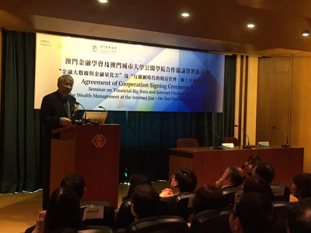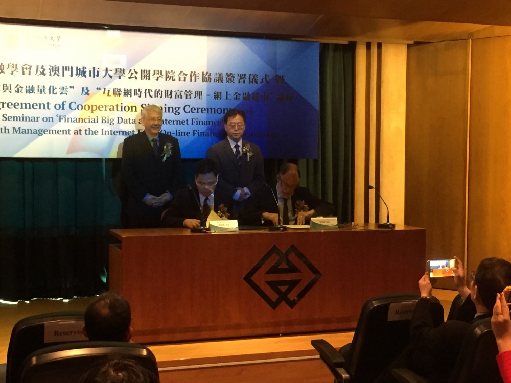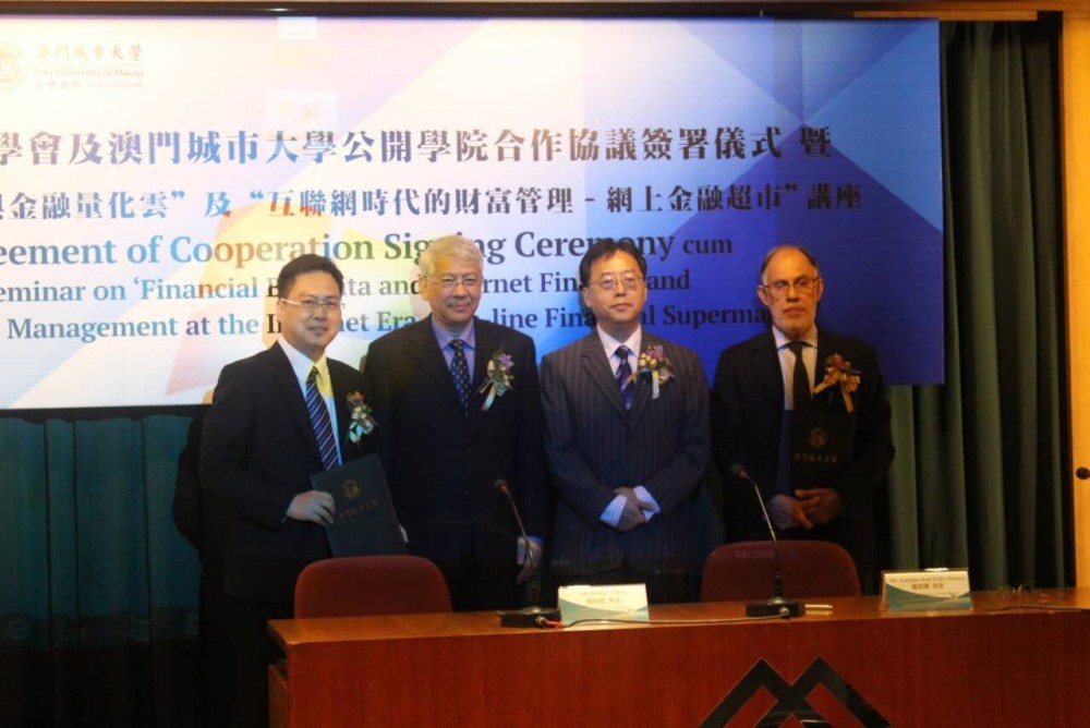 On 9 April 2016, an agreement signing ceremony was held to commemorate the cooperation between the Open Institute of City University of Macau (OI-CityU) and Macau Institute of Financial Services (IFS). The Agreement Signing Ceremony was held in the Auditorium of the Monetary Authority of Macau. The ceremony began with a welcome speech by Mr. António Félix Pontes, Chairman of Executive Board of IFS; and Professor Shu Guang Zhang, Rector of CityU; and the Agreement was thereafter signed by Mr Félix Pontes and Mr Robert Chan, Director of OI-CityU cum Secretary General of the Council of CityU, in the presence of witnesses Mr Anselmo Teng (AMCM), Chairman of the Board of Directors of the Monetary Authority of Macau, and Professor Zhang.